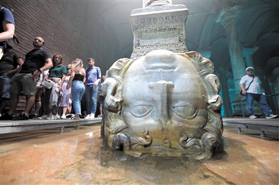 7月23日,游客在土耳其伊斯坦布尔的地下水宫参观美杜莎雕像。
