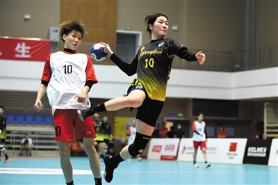 7月24日,在江苏常州举行的2022年全国女子手球冠军杯第三轮比赛中,上海队以31∶15的比分战胜北京队。图为上海队球员包纪仪(右)在比赛中射门。