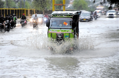 7月25日,车辆涉水经过巴基斯坦卡拉奇一条被积水淹没的道路。