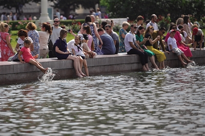 7月27日,在俄罗斯首都莫斯科,人们在国民经济成就展览馆的喷泉旁消暑。