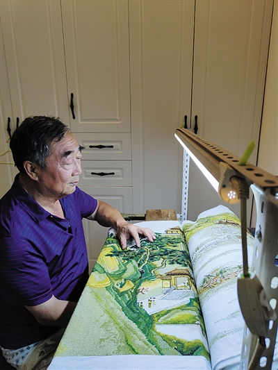 记者在胡凯明家中看到,他的卧室就是工作间,卧室内的桌子上摆放着各种彩线、图册、剪刀、绕线板、银针等工具。他说,6年来,绣十字绣已经变成了一种习惯,绣针、丝线是他最好的伙伴,轻挑慢捻、穿针引线是他每天的必修课,经常是清早坐在支架前,一绣就是十多个小时,达到了废寝忘食的程度。期间家人也给予他最大的理解和支持,成为他刺绣的最大动力。