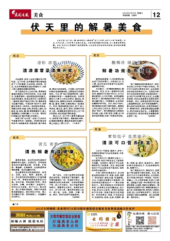 三伏天里,出门走一圈,相信很多人都会有“出门5分钟,流汗2小时”的感觉。而且,天气炎热,人们的胃口也随之变差。尤其是高温爆炒的食物,让人看着就觉得油腻。在此,本刊为大家推荐几道消暑食物,让这些或清凉或清淡的美食,陪你度过酷暑难当的三伏天。