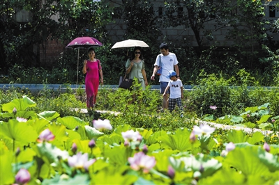 ◀8月3日,游客在重庆市万州区恒合土家族乡石坪村“荷花廊道”游览。