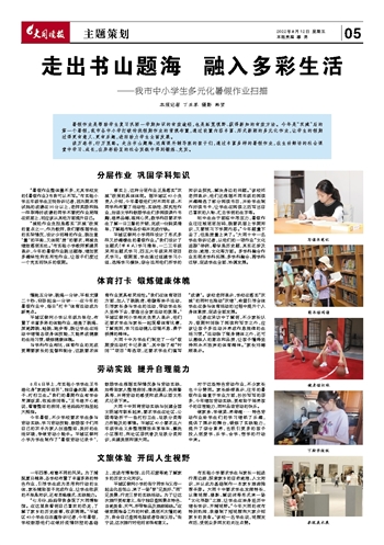 暑假作业是帮助学生复习巩固一学期知识的有效途径,也是拓宽视野、获得新知的有效方法。今年是“双减”后的第一个暑假,我市各中小学打破传统假期作业的常规布置,通过设置内容丰富、形式新颖的多元化作业,让学生的假期过得更有意义、更有乐趣,进而助力学生全面发展。