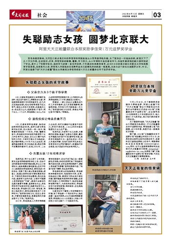 ~~~阿里天天正能量联合本报奖励李佳荣1万元追梦奖学金