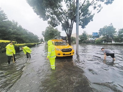 “百盛无积水”“金牛岗无积水,车辆通行正常”“一医院易涝点收水正常”;通过西苑路七中泵站泵的起停和云中路泵站配合,西苑路桥涵下的水位线基本保持在10厘米左右,车辆通行正常;“前方积水严重,请掉头绕行,注意安全!”早上7时40分许,南环西延枫林逸景下穿通道桥涵积水30厘米,放置了警示牌,大车正常通行,小车劝返。在各积水点,市政人冒雨“逆行”,有的负责指挥交通,提醒过往车辆注意安全;有的手持撬棍打通窨井盖;有的盯紧收水进口,保证进水断面不受杂物淤堵;有的在泵站观察水位情况,适时开闸放水……