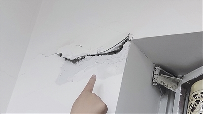 13日,记者接到反映后赶往该小区走访。许先生家的厨房、阳台、小卧室都有裂缝,小卧室天花板有两条大约2米长的裂缝用胶带粘住了。许先生说,两条裂缝正在床的上方,不时往下掉砂石、墙皮等,他不得不临时采取措施,将其粘住。
