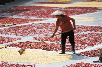 8月14日,村民在贵州省锦屏县大同乡秀洞村晾晒农作物。