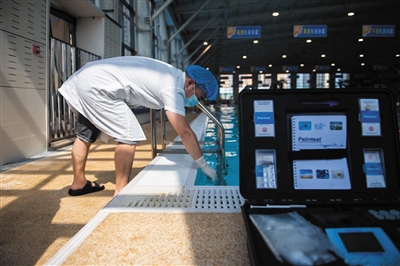 ▲8月16日,在汉寿县沧浪街道一游泳馆,卫监部门工作人员在泳池取样准备检测水质。