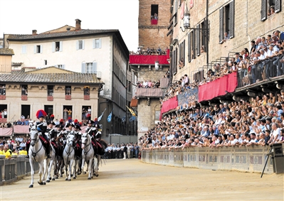 ▶ 8月15日,意大利宪兵在锡耶纳举行的赛马节热身赛前进行表演。