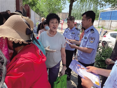 发现情况后,社区网格员立即向街道、派出所进行举报,执法人员快速赶赴现场合力处置。到达现场后,执法人员发现其营业执照及授权书均已过期,而且水壶质量很差。执法人员现场拍照登记,作为下一步行动的证据资料。随后,派出所和社区工作人员通过介绍案例、发放传单等形式,向老人们普及涉养老诈骗防范知识,嘱咐老年人不要贪图小利,不要轻信陌生人,遇到要求转账的电话要及时和子女沟通,发现诈骗线索及时报警,防止不必要的财产损失。