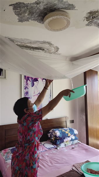 记者在白女士家看到,漏雨非常严重,楼顶墙皮几乎全部脱落,卧室、客厅多盏装饰灯已损坏,卧室、餐厅上空搭起塑料棚子,以防止漏雨。地上到处是接水盆。