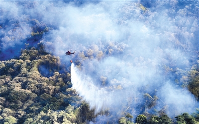 ▶ 8月18日,一架救援直升机在重庆涪陵进行灭火作业。