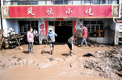 ◀ 8月18日,受灾群众在青海省西宁市大通回族土族自治县青山乡清理淤泥开展自救。