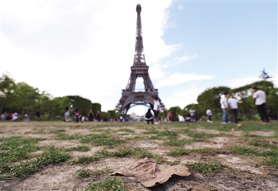 ◀ 这是8月17日在法国巴黎战神广场拍摄的干枯的草坪和干枯脱落的树叶。