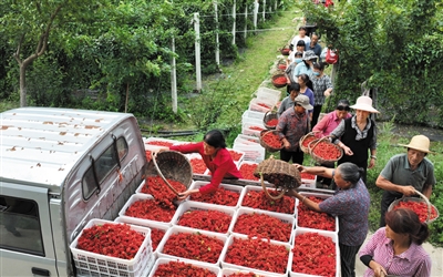 ▲8月21日,洛南县煜正中药材专业合作社的员工将采摘的五味子统一装车运往加工车间。