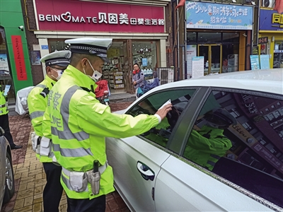 是日上午,记者在南环路看到,交警支队九大队民警走进临街商铺开展文明交通宣传,向商户讲解创建全国文明城市的重要意义,提醒群众按规定停放机动车和非机动车,不占道经营、不私搭乱建。对于违停车辆,采取张贴“违法停车温馨提示单”,督促车辆尽管驶离现场。对于在停车位内逆向停放的车辆,则张贴写有“车头方向不对。本次警告,不处罚。”字样的告知单。