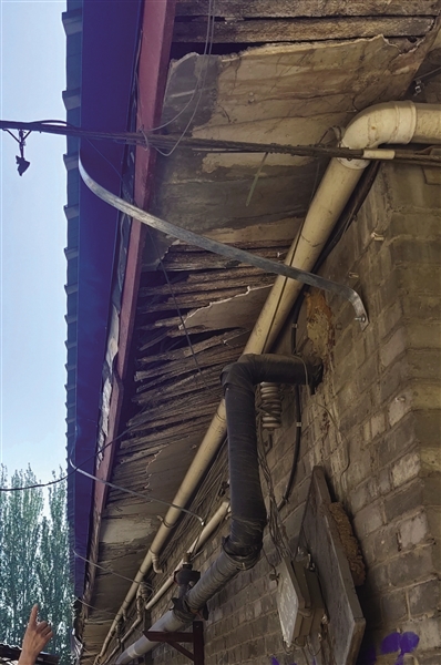 昨日,记者在山橡家属区走访看到,1排后房檐多处水泥裂缝严重,随时有掉落的危险,房顶上的木条也出现掉落的现象。整条小巷不宽,而1排房房檐就伸出有六七十厘米。