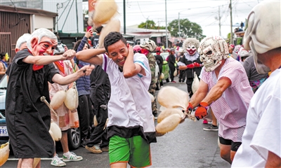 每年8月底,哥斯达黎加埃雷迪亚省巴尔瓦都会举办传统面具巡游活动。活动中,戴着面具的“小丑”遵循当地习俗,用手中提着的充气物出其不意地“敲打”参加巡游的民众。这一活动因新冠疫情中断了两年,今年再次举行。