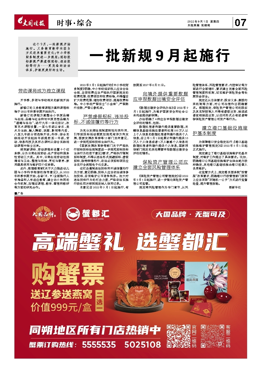 ~~~这个9月,一批新规开始施行。义务教育教学内容与方式迎来重要变化;中小学校财务制度进一步规范;招标投标新规严禁虚假招标、违法投标等行为……更完备的法治体系,护航更美好的生活。