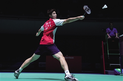 9月1日,在日本大阪举行的日本羽毛球公开赛男子单打第二轮比赛中,中国选手石宇奇以2∶0战胜法国选手利弗德斯,晋级八强。图为石宇奇在比赛中回球。