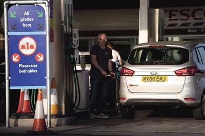 ◀ 9月2日,在英国曼彻斯特,一名男子在加油站加油。