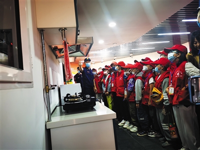 拾级而下,顺着通往科普馆的通道,大家依次参观了消防战斗员常用的装备,了解消防安全常识。“最令我惊奇的是消防体验馆设置的模拟灭火系统,都在时时刻刻地提醒我们要注意防火”。在灭火和防火实训区,讲解员为大家讲解了日常生活中常见的电气和厨房火灾预防措施。在智能厨房火灾隐患排查平台,小记者们积极参与,快速找出了5处火灾隐患,并学习了当发生煤气泄漏、灶具起火时的正确处理方式。在逃生实训区,小记者分组体验了模拟烟雾逃生通道演练,身临其境的感触让小记者们提升了火灾现场疏散和逃生技巧。