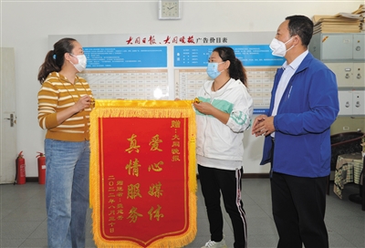 今年6月底,在阿里公益天天正能量联合大同晚报在内的重点合作媒体发起的2022届“正能量励志学子追梦计划”中,我市云州区两位励志学子刘翔和刘磊获得资助,顺利步入大学校园。5日上午,刘翔母亲和刘磊奶奶分别向大同晚报编辑部、大同日报社社会新闻二部赠送了锦旗,以表达对媒体人的感谢。