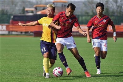 9月6日,在江苏南京举行的2022赛季中国足球协会甲级联赛第19轮比赛中,辽宁沈阳城市队以1∶0战胜陕西长安竞技队。图为陕西长安竞技队球员杜长杰(左)在比赛中与辽宁沈阳城市队球员肖智拼抢。