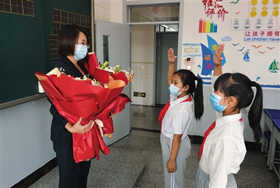8日上午,平城区十里店学校用充满仪式感的红色拱门、五彩缤纷的气球将校园装扮得分外美丽。课间,各年级学生依次排开,拱手作揖行“拜师礼”,以表达对教师的尊敬之情。各班学生代表将学校准备好的鲜花敬献给老师,感谢恩师的谆谆教诲。