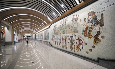 南起新宫站北至牡丹园站的北京地铁19号线一期全线投入运营一个多月,地铁站内的美术和建筑艺术成为一大亮点。北京地铁19号线站台环境设计以“荟萃京华”为主题,各式各样的壁画、灯饰等展示了北京丰富的历史和文化积淀。