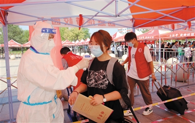 “请同学们排好队,出示录取通知书和返校审批表,扫场所码进入校园”……入口处,同学们经过一系列检查后陆续进入校园。按照疫情防控工作规定,家长一律不能进入校园,考虑到学生来校当天行李较多,学校安排志愿者在校门口帮助学生将行李托运到寝室。校园里,各学院志愿者在本学院引导点、服务点等待学生报到。