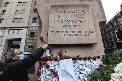 9月11日,在智利首都圣地亚哥,民众在前总统阿连德雕像前献花,纪念他遇难49周年。