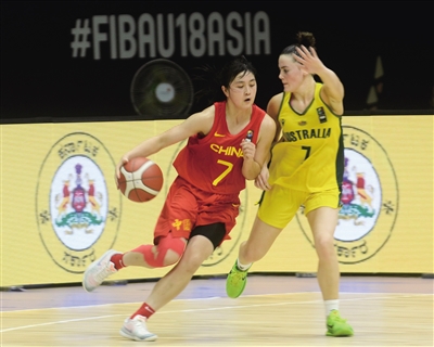9月11日,在亚洲U18女篮锦标赛决赛中,中国队以55∶81不敌澳大利亚队,获得亚军。图为中国队球员王静(左)和澳大利亚队球员洛里奇拼抢。