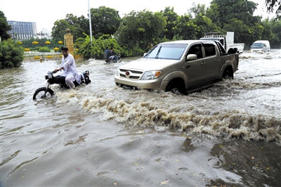 9月12日,在巴基斯坦卡拉奇,车辆在洪水中前行。