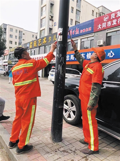 近日,平城区新旺街道柳港园南院社区党支部联合党建联盟成员单位平城区环卫清洁二公司、市国天安居物业管理有限公司,对辖区外围“野广告”进行集中清理,助力创城。 本报记者 杨翠叶