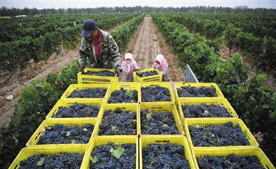 ◀9月16日,工人在宁夏银川市贺兰山东麓的沃尔丰酒庄转运酿酒葡萄。