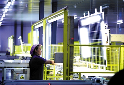 ▶9月17日,在山东省东营经济技术开发区润马光能科技有限公司生产车间,工人对太阳能电池板进行质量检测。