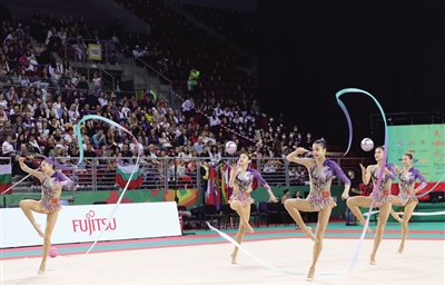 9月18日,在保加利亚索非亚举行的2022年艺术体操世锦赛团体3带2球项目决赛中,中国队获得第四名。图为中国队在团体3带2球项目决赛中。