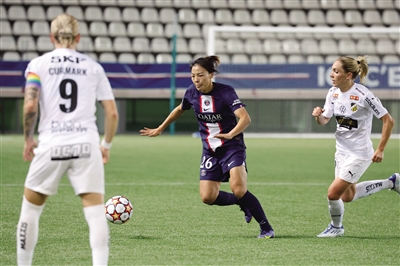 9月21日,在2022-2023赛季欧洲女足冠军联赛资格赛第二轮首回合比赛中,巴黎圣日耳曼队主场以2∶1战胜赫根队。图为巴黎圣日耳曼队球员李梦雯(中)在比赛中。