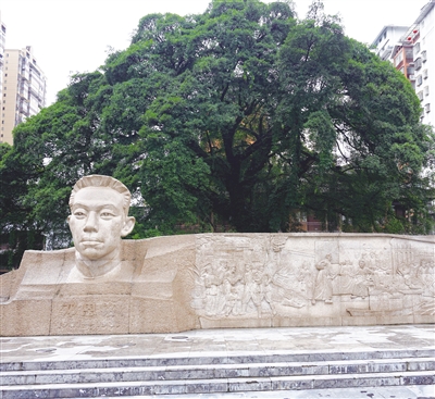 车停在县城一座城门楼前,抬眼望去,二层楼阁飞檐翘角,青砖黛瓦,古朴典雅,上方题有“北门”二字。穿过拱形门洞,一棵巨大的榕树映入眼帘。古树枝繁叶茂,郁郁葱葱,藤蔓苔藓虽布满枝干,也难掩两百来年的树龄。榕树掩映下,一条长长的雕塑镌刻着邓恩铭的头像和一组浮雕。他目光坚定刚毅,若有所思,英俊豪迈,充满凛然正气。