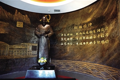 邓恩铭烈士纪念馆比邻而居。正厅矗立着邓恩铭烈士全身塑像,他身着长衫,手拿一卷书,深邃的目光注视远方。背景墙上镶嵌着党徽、“红船”和“红船精神”的内涵,熠熠生辉。