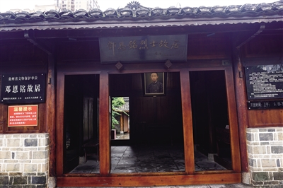 不远处,一座低矮的砖木结构民居院落临街而立,这是邓恩铭烈士故居。厅堂一侧摆满了药柜,抽屉和坛坛罐罐上均标注药材名,天井后面是一间豆腐坊。从布局和陈设中可知,父亲以行医卖药为生计,母亲制作豆腐补贴家用,邓恩铭时常帮忙磨豆腐。其实,这里不是邓恩铭的出生地。1901年,他出生于水族村寨——水浦村板本寨,离县城有40多公里。1905年,为了躲避匪患,维持生计,举家迁至县城生活。