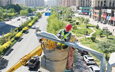 图为25日工作人员正在更换文兴路损坏的路灯。 本报记者 于宏摄