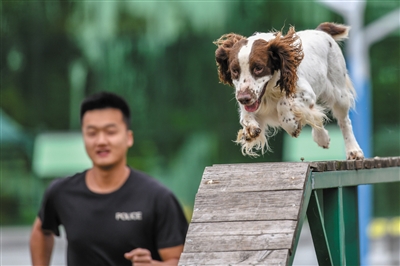 9月20日,搜索犬“馒头”在进行越障训练。