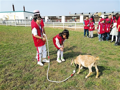 擂鼓、跳“拖拉机舞”……一系列活动让现场氛围一下子热闹起来。让他们更欣喜的活动接踵而至,“拔萝卜,拔萝卜,嘿呦嘿呦拔萝卜……”这是孩子们来到菜地现场采摘萝卜的情景。绿茵茵的缨子带出黄澄澄的萝卜,劳动收获后的快乐写在孩子们的脸上。第一次学拌猪食,将玉米面和水搅拌后喂猪;采摘青草,牵引小羊遛弯、觅食……小记者们在充实的劳作体验中,懂得了一粥一饭的来之不易,了解饲养家畜的辛苦。