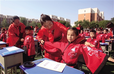 图为老师为参加开笔礼的学生正衣冠。 本报记者 韩堃 摄