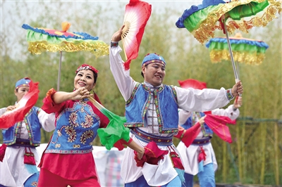 ▲ 在河北省石家庄市井陉县小作镇一家现代农业园,当地群众扭“拉花”欢度国庆节。