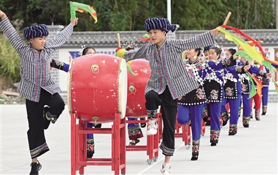 ▲ 苗族同胞在贵州省铜仁市松桃苗族自治县正大镇麻塘村打花鼓,欢度国庆。