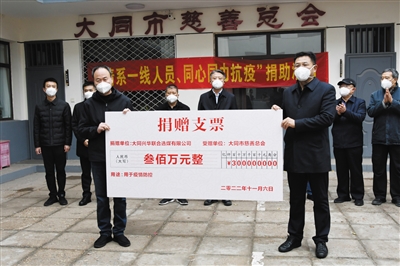 本报讯 (记者 杨昱郁) 在抗击疫情的关键时期,大同兴华联合选煤有限公司以善举践行社会责任,11月6日,向市慈善总会捐款300万元用于疫情防控。